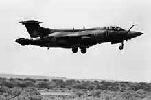 After the cancellation of the TSR-2, and then the substitute American General Dynamics F-111K, the Royal Air Force still required a replacement for its Canberras in the low-level strike role, while the planned retirement for the Royal Navy's aircraft carriers meant that the RAF would also need to add a maritime strike capability. It was therefore decided in 1968 that the RAF would adopt the Buccaneer, both by the purchase of new-build aircraft, and by taking over the Fleet Air Arm's Buccaneers as the carriers were retired.[25][26][27] A total of 46 new-build aircraft for the RAF were built by Blackburn's successor, Hawker Siddeley, designated S.2B. These had RAF-type communications and avionics equipment, Martel air-to-surface missile capability, and could be equipped with a bulged bomb-bay door containing an extra fuel tank.[28]