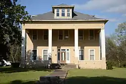 The Hawkins House is a historic house at the northwest corner of 3rd Avenue and 3rd Street in Foreman, Arkansas. It is a 2+1⁄2-story wood-frame structure, built in 1912, and is one of the city's few surviving properties from its boom period in the early 20th century, dating to the arrival of the railroad. It is a vernacular Foursquare house, given an L shape by the attachment of a hip-roofed ell to its northwestern corner. Its front elevation is dominated by a two-story recessed porch, supported by concrete block columns.[2]