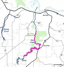Hay Creek is a small trout stream in southeastern Minnesota. It has its headwaters west of Goodhue and empties into the Mississippi River just to the north of Red Wing.[2] It runs 25.1 miles (40.4 km).[3] Hay Creek was named for the hay meadows near its banks.[4] A railroad once ran along Hay Creek from the claybanks near Goodhue to the pottery and stoneware factories in Red Wing, which also made use of the water from the creek. The railroad was torn up in 1937, but traces such as trestle pilings remain.[5]