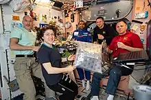 Due to the "direct handover" that was needed to facilitate Al Mansoori's short duration mission, his mission occurred during an unusual time when nine people were aboard the ISS, the three crew members who had launched on Soyuz MS-12, Aleksey Ovchinin, Nick Hague and Christina Koch, the three who had launched on Soyuz MS-13, Aleksandr Skvortsov, Luca Parmitano and Andrew Morgan, and the three who had launched aboard Soyuz MS-15.[16] During his short stay aboard the ISS, Al Mansoori conducted 15 experiments created by UAE school students and selected under an MBRSC "Science in space" competition,[17][18] conducted Earth observation experiments, filmed the first ever tour of the ISS in Arabic and became the first Middle eastern person to be studied following time in microgravity.[19][20]