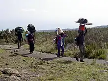 It is also wide-spread in Africa. Women in particular may have practical reasons for carrying on the head. For many African women it is "well-suited to the rough, rural terrain and the particular objects they carry—like buckets of water and bundles of firewood". The practice is usually not abandoned they migrate to urban areas where their daily routines, and socially accepted practices, are different. In Ghana, affluent residents of the southern cities employ young women who migrate from the poorer northern region to work as "head porters", called kayayei, for $2 a day.[3] In East Africa, Luo women may carry loads of up to 70% of their own body weight balanced on top of their heads. Women of the Kikuyu tribe carry similar heavy loads, but using a leather strap wrapped around their forehead and the load to secure it while it is carried. (see tumpline) This results in a permanent groove in the forehead of the women. However, there is no evidence of other harmful effects on the health of women who carry heavy loads on top of their heads. Researchers speculate that training from a young age may explain this. Up to 20% of the person's body weight can be carried with no extra exertion of energy.[4] Other researchers have shown that African and European women carrying 70% of their body weight in controlled studies used more oxygen while head-carrying, in contrast to carrying a load on their backs. The research did not support the notion that head-loading is less exerting than carrying on the back, "although there is some evidence of energy saving mechanisms for back-loading at low speed/load combinations".[5]