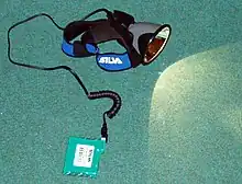 Thomas Edison developed electric cap lamps for miners in 1914; by 1915, certain cap lamps were approved by the United States Bureau of Mines for safe use where there may be inflammable gas as in coal mines. These included features such as spring-loaded contacts to automatically disconnect broken bulbs.[3] These lamps consisted of an incandescent lamp with a reflector, and a belt-mounted wet-cell storage battery sized to power the lamp for the entire working shift. After 12 hours a 1917-era miner's lamp produced less than one candlepower and about 2 to 5 total lumens.[3] This pattern became popular for similar lamps.[4] Head lamps approved for use in coal mines are designed not to allow an internal spark to ignite flammable gas surrounding the headlamp.