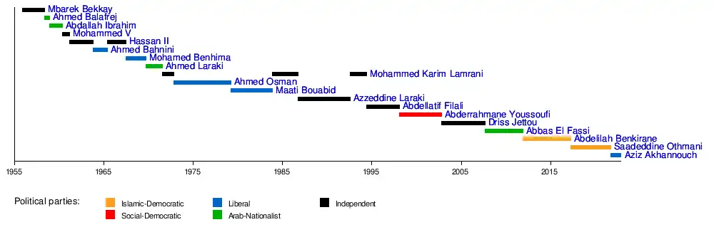 This is a list of heads of government of Morocco since the formation of the post of Prime Minister of Morocco in 1955, to the present day.