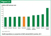 Australia's health-expenditure–to–GDP ratio (~9.5%) in 2011–12 was slightly above average compared with other OECD countries.[11]