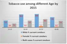 From the Table above, Tobacco relatively used in rural 4.3% than urban 3.9% for both sexes current smokers. The percentage of male's current smokers among 45-59 age group 10.4%, 1% Female's and both sexes’ current smokers are 6.5% and the use of tobacco among this age group shows increasing when compared to others age group in 2015. The overall tobacco use among adults age (15+) were 4.2% in 2015 and declined to 4% in 2016. Smoking prevalence of males were high according to both residences and among all age group when compared to females.