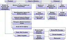 In the end of 2014 By Government of Georgia was approved Georgian Healthcare System State Concept 2014-2020 “Universal Healthcare and Quality Management for Protection of Patient Rights”, which is a vision of healthcare system development that comprises basics of the sector development in relation to principles and values recognized at international and national levels[14] Ministry of Labour, Health and Social Affairs (MoLHSA) is formally accountable for the health of the population, oversight of the health system, the quality of health services and equity in relation to access to health care throughout the country[15] There are Legal entities under state control of the Ministry: LEPL “Social Service Agency” (SSA), LEPL “National Centre for Disease Control and Public Health” (NCDC), LEPL "State Regulation Agency for Medical Activities (SRAMA) and LEPL Emergency Situations Coordination and Urgent Assistance Center (ESC&UAC). Administration and management of the Health and Social care State Programs including UHC is providing by SSA, which is subordinated institution under the MoLHSA. SSA's territorial offices are located at 68 municipalities and more than 2000 are employed in them[16]