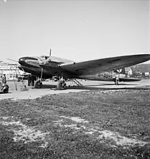 The first prototype, He 111 V1 (W.Nr. 713, D-ADAP), flew from Rostock-Marienehe on 24 February 1935.[17] It was followed by the civilian-equipped V2 and V4 in May 1935. The V2 (W.Nr. 715, D-ALIX) used the bomb bay as a four-seat "smoking compartment", with another six seats behind it in the rear fuselage. V2 entered service with Deutsche Luft Hansa in 1936, along with six other newly built versions known as the He 111C.[18] The He 111 V4 was unveiled to the foreign press on 10 January 1936.[18] Nazi propaganda inflated the performance of the He 111C, announcing its maximum speed as 400 km/h (250 mph); in reality its performance stood at 360 km/h (220 mph).[19] The He 111 C-0 was a commercial version and took the form of the V4 prototype design. The first machine was designated D-AHAO "Dresden". It was powered by the BMW VI engine and could manage a range (depending on the fuel capacity) of 1,000 to 2,000 km (620 to 1,240 mi)[19] and a maximum speed of 310 km/h (190 mph).[20] The wing span on the C series was 22.6 m (74 ft).[20] The fuselage dimensions were 17.1 m (56 ft) in the He 111 V1, but changed in the C to 17.5 m (57 ft). The Jumo 205 diesel powerplant replaced the BMW VI. Nevertheless, the maximum speed remained in the 220 to 240 km/h (140 to 150 mph) bracket. This was increased slightly when the BMW 132 engines were introduced.[20]