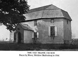 Exterior of the Old Trappe Church founded by Henry Muhlenberg. Note: Caption date is wrong; he founded it in 1742 or later.