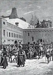 Helena's Orthodox faith created a number of complications. Alexander had to receive a special permission from Pope Alexander VI to marry a non-Catholic and sign a formal agreement with Ivan III in October 1494 that Helena would not be forced to convert. Alexander wanted to add that if she wished so herself, Helena could convert, but Ivan III adamantly rejected the amendment.[12] Ivan III left Helena with detailed instructions on how to behave, whom to invite for lunch, where to pray (she was prohibited from visiting Catholic churches).[13] Ivan III also requested that Alexander would build an Orthodox church in Vilnius Castle Complex. In January 1495, Helena, accompanied by eighty nobles and servants, departed Moscow towards Vilnius.[13] She reached Vilnius on 15 February 1495 and the same day the couple was married. The marriage ceremony was a complex combination of Catholic and Orthodox traditions. Helena prayed and prepared in the Cathedral of the Theotokos before moving to Vilnius Cathedral.[13] She was dressed in a traditional Russian wedding dress. The wedding ceremony was officiated by Catholic Wojciech Tabor, Bishop of Vilnius, and Orthodox Foma, priest who accompanied Helena from Moscow.[14] Reportedly Helena did not bring much dowry (jewelry, three icons, silver and gilded dishes, expensive fabrics, furs, a carriage with horses) and Alexander did not gift her with lands after the wedding (he did so only in August 1501).[15]