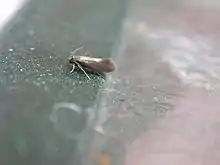 A family of primitive monotrysian moths in the order Lepidoptera, Heliozelidae are small, metallic day-flying moths with shiny smooth heads. In Europe the small adult moths (genera Antispila and Heliozela) are seldom noticed as they fly quite early in the spring. The larvae are leaf miners [2] and the vacated leaf mines are distinctive because the larva leaves a large hole at the end.