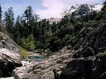 The gold rush of 1849 on the South Fork of the American River resulted in establishment of Sierra foothill towns of Auburn, Placerville, Nevada City and Georgetown. The gold rush did not intrude into the higher elevations of the Sierra Nevada range, but the water and timber needs of these towns did intrude into the upper elevations. In one case in 1873 the privately owned, California Water Company[11] employed a scheme to dam Loon Lake to the south of Hell Hole and then sluice the water closer to Georgetown where it could be used by residents and farmers.[12]