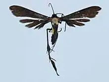 The wingspan is 22–25 millimetres (0.87–0.98 in). Adults are black and have enlarged scale tufts on the hind legs. The wings have a purplish iridescence. They have a wasp-like appearance. Adults are primarily diurnal, which is unusual for the family Pterophoridae. They have been recorded in July, August, September, October and December in Mexico and in June in Costa Rica.[1] Adults are on wing from June and July to October, and in December.