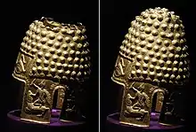 Almost a kilogram heavy, the gold helmet is very well preserved, missing only the part of its skull cap. The form of the helmet and its decorations reveal the autochthonous character of this Geto-Dacian artwork. The helmet is decorated with large studs on the top of the skull and two very large apotropaic eyes, meant to ward off the evil eye and magic spells.[1] It was established that it belonged to an unknown local Geto-Dacian king or to a local aristocratic noble, from around year 400 BC.[1] One theory — without any proof, however — is that this item was the sacred helmet of Zalmoxis, the living god-prophet of the Dacians.