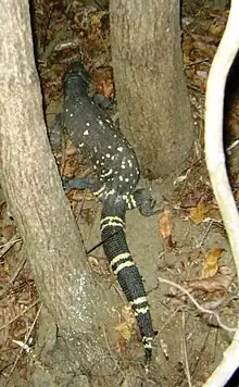 H. charlesbogerti dwells in arroyos characterized by high densities of bird nests of doves and parakeets, whose eggs form the primary component of its diet.[12] These birds nest closer to the ground in these arroyos in trees with branches thick enough to support the weight of this heavy-bodied lizard.[12] It is known to prey upon insects, such as beetles and crickets.[10] The eggs of the Guatemalan Spiny-tailed Iguana (Ctenosaura palearis), an endangered species endemic to the same region, are an important food source for the Guatemalan beaded lizard, thereby possibly linking the status of the two.[13]
