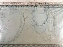 Stencil painters favoured the use of distemper.[103] The base layer was left for several hours to dry,[104] after which the stencils were filled in with either a pig's hair brush or a stippler.[105] For more complex patterns series of stencils were used in sequence with fiducial markers to achieve synchronization. The artist would proceed step-wise across the surface and create a semblance of depth by varying tints.[106] Stencils were seemingly popularized by Jonas Wallström, but they were soon adopted by many Helsingian and Dalcarlian artists active in the province.[107] By the middle 19th century the cost of printed wallpaper decreased, which eventually contributed to the decline of stencil painting.[104]