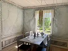 Wallström was born in Vallsta and took a new surname after his birthplace.[62] Between 1814 and 1821 he lived in Hudiksvall working as an apprentice of artist Anders Winberg.[63] He continued as a journeyman at Gustaf Söderberg's workshop in Stockholm 1823–1831 and most likely received tutoring from tapestry painter Carl Fredric Torsselius.[62][63] As he returned to the Vallsta area in the 1830s he quickly became the most distinguished stencil painter of the middle Ljusnan river valley.[64] He has completed several interiors consisting of free hand motifs and stencil painting. Wallström's typical style includes gilded frames, colonnettes and ornamentation in Karl Johan style, with expertly drawn and rich stencil patterns. The motifs between these ornaments are usually romantic landscapes or pastorals.[65][66] The decorated interiors of Gästgivars in Vallsta completed by Wallström have attained World Heritage status.[64] Other works by him are kept at the Hälsingland Museum,[67] Renshammar in Bollnäs, Wallins in Växbo, Lars-Pers in Hov and at Arbrå Fornhem.[65]