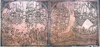 Henry and his crusade to Finland were also a part of the legend of King Eric. The appendix of the early 13th century Västgötalagen, which has a short description of Eric's memorable deeds, also makes no reference to Henry or the crusade.[9] Henry and the crusade do not appear until a version of Eric's legend that dates to 1344. Similarities in the factual content and phraseology regarding the common events indicate that either one of the legends has acted as the model for the other.[10] Henry's legend is commonly considered to have been written during the 1280s or 1290s at the latest, for the consecration of the Cathedral of Turku in 1300, when his alleged remains were translated there from Nousiainen, a parish not far from Turku.[11]