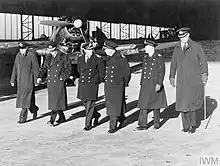 While at RAF Hatston in Orkney in April 1942 Fancourt, flying a Gloster Gladiator, is claimed to have made the first landing of the war by a British plane on an American aircraft carrier when the USS Wasp was passing through Scapa Flow, however Lt Basil Boulding of 812 Sqn has a better claim as he landed Swordfish P4219 aboard the USS Wasp from RAF North Front, Gibraltar, eventually disembarking at RNAS Macrihanish prior to the USS Wasp's arrival at Scapa Flow and joining Force H.[2] In 1942, Fancourt had been assigned to take command of the escort carrier HMS Searcher, then under construction in the United States. This was cancelled, however, and he took command of the 4th Destroyer Flotilla which consisted of two destroyers, HMS Broke and HMS Malcolm, assigned to Operation Torch, the allied invasion of French North Africa. The destroyers were to land a detachment of American Rangers. The assignment was to enter Algiers harbour on 8 November, land the troops and prevent the Vichy French from scuttling their ships or wrecking the port installations (Operation Terminal).
