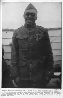 In 1918, the French awarded Johnson with a Croix de guerre with star and bronze palm. He was the first African American U.S. soldier in World War I to receive that honor.[3][5]