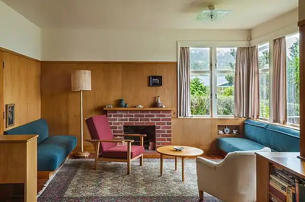 Privately, Kulka realized over 40 fine wooden houses throughout New Zealand. His wooden houses were innovative in their spatial and material resolution. The Halberstam House in Wellington (1948)[16] is an excellent example of Kulka's ability to design compact minimal dwellings. The single level bungalow sits on top of a small hill in Wellington. It had a very modest construction budget and post war building restrictions were imposed on the commissioners. Notwithstanding these constraints, Kulka built a striking cubic bungalow clad with dark stained weather boards on the exterior with the uplifting surprise of a luminous and calming interior consisting of fine honey coloured native wood panels and clean fibrous plaster. In this modest sized family home a small piano nook is built subtly into the lounge. This nook is separated from the main body of the lounge by the minimal gesture of a bookcase which projects a little into the lounge.[17] A small lowered ceiling above the nook adds to the sense of separateness, snugness of this sub-space. Built in seating on either side of a fireplace are positioned toward the view of northerly hills, and the light. Cosiness, economy and functionality are brought together to achieve a sense of gentle refinement. Notwithstanding the Halberstam villa's more modest scale compared to other Kulka Houses in New Zealand, it remains exemplary of the spirit of his work spatially and materially. Kulka's prolific building continues to influence Modern Architecture in New Zealand.