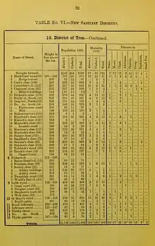 During his first three years in the post, Littlejohn carried out a meticulous investigation into the living conditions and the state of health of the town's inhabitants. His report, published in 1865, contained 120 pages of detailed statistics, analysing conditions in over one thousand separate streets, closes and tenements. It included extensive data on the prevalence of the most common diseases as well as historical data on earlier epidemics. The report convincingly demonstrated the link between depravation, disease and mortality.[6]