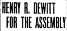- "Henry R. DeWitt for the Assembly". The Kingston Daily Freeman. October 13, 1915. Retrieved 18 June 2018.