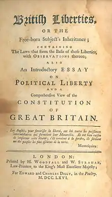 - British Liberties, or the Free-born Subject's Inheritance; Containing the Laws that Form the Basis of those Liberties, with Observations thereon; also an Introductory Essay on Political Liberty and a Comprehensive View of the Constitution of Great Britain. London: Printed by H[enry Sampson] Woodfall and W[illiam] Strahan, Law-Printers to the King's Most Excellent Majesty; for Edward and Charles Dilly, in the Poultry. 1766. OCLC 65349667.