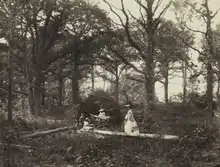 A charming example of his best known style is an intimate, lyrical landscape taken in 1856 in northern Wales. The family in the photograph is almost certainly his own, and he has carefully balanced his desire to faithfully record elaborate details with broad atmospheric effects. As with many of his images, this print registers a city-dweller's delight in finding himself in natural surroundings.[1]