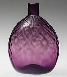 Stiegel advertised "enameled glass" for sale, and while he apparently did produce some actual enameled glass in his factory, it was long thought that this referred to the brightly colored style of "peasant glass" produced in Bohemia, Germany and Switzerland, some of which was imported to America. This type, whether made in Europe of America, is still often called "Stiegel-type" glass in America, even though it is now thought that Stiegel's advertisements actually meant white milk glass or the use of twisting white canes within stemware, not true enameled glass.[7] Etched clear glasses may also be called "Stiegel-type".