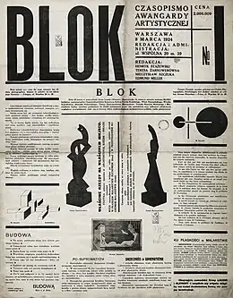 At Blok, Stażewski collaborated with Henryk Berlewi and Szczuka who were considered leading figures in Polish avant-garde typography. After Blok was dissolved in 1926 due to internal disagreements, Stazewski became one of the co-founders of the avant-garde collectives Praesens (1926–1929) and later a.r. group (1929–1936), both of which also became critical in defining the direction of Constructivism in Poland.[4] As a member of these groups, Stażewski contributed to Polish Constructivism through typography, posters, theoretical writings (including publications for the Blok magazine published between 1923 and 1926), as well as interior design and furniture design.[8] Though predominantly idealistic and of limited impact on the Polish post-World War I society, the Constructivists completed some important architectural projects (Praesens, for instance, participated in the design of apartment buildings for the Warsaw Housing Cooperative in the Rakowiec district)[6]: 123–124 and imbued the Polish avant-garde, up until then largely autonomous, with a sense of social commitment.[6]: 128