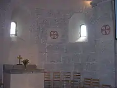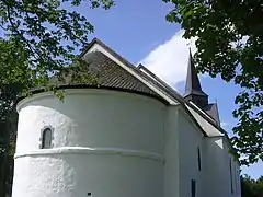 The earliest existing historical records of the church date back to the year 1432, but the church was originally constructed during the second half of the 1100s. The church has a rectangular nave, a tower to the west, and a narrower choir with a semicircular apse. The choir and apse have a lower roof line than the nave. Research on the building has shown that the choir part is the oldest part of the existing building with the apse and nave built a little later. Originally, the current choir was the stone nave that was attached to a wooden building. The wood building was later torn down and the stone building was expanded. Over the years, the church fell into disrepair. During the early 1400s, the western wall of the church was taken down and the stone nave was shortened by about 4 metres (13 ft) and then a new wall was built. In 1879, the church was enlarged by doubling the length the nave (adding about 10 metres (33 ft) to the nave) and then a new west tower was added on the end of the new nave. In the 1960s, the church was thoroughly renovated by the architect John Egil Tverdahl.[3][4]