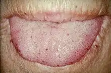 Telangiectasia (small vascular malformations) may occur in the skin and mucosal linings of the nose and gastrointestinal tract. The most common problem is nosebleeds (epistaxis), which happen frequently from childhood and affect about 90–95% of people with HHT. Lesions on the skin and in the mouth bleed less often but may be considered cosmetically displeasing; they affect about 80%.[1][2] The skin lesions characteristically occur on the lips, the nose and the fingers, and on the skin of the face in sun-exposed areas. They appear suddenly, with the number increasing over time.[2]