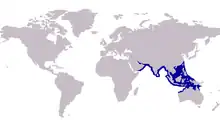 The herring scad is distributed throughout tropical to subtropical regions of the Indo-West Pacific oceans. The species has been recorded from the Red Sea, eastward to Sri Lanka, India, Southeast Asia, China, Indonesia, the Philippines, New Guinea, and as far north as Taiwan[4] and as far south as northern Australia.[9] The herring scad is most commonly found in shallow coastal regions where it inhabits the surface layers of the ocean over a variety of substrates.[8]