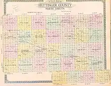 The Dakota Territory legislature created the county on March 9, 1883, with territory partitioned from Stark County. Its government was not organized at that time. The county name was chosen by territorial legislator Erastus A. Williams, to honor his father-in-law, Mathias K. Hettinger (1810-1890), who had been a banker and public figure in Freeport, Illinois. A settlement on the Cannonball River was selected as the county seat (Mott).