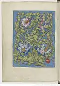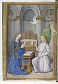17 historiated letters on a background of gold which spell "Ave Maria, gracia ple[na]" from the first chapter of Luke. This is the reading for the Feast of the Annunciation (March 25) The first letter is copied from the alphabet of Master E. S. (itself inspired by the late-14th century pattern-book by Giovannino de' Grassi). Testard seems to have modeled the rest of the letters upon another woodblock alphabet of around 1464 from Flanders or the Netherlands.[10] |