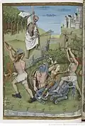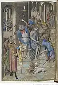 Testard has been influenced here by Netherlandish printmaker Master I. A. M. of Zwolle's Battle of Two Men with a Centaur, to which he introduces Death, a lion and a wild-woman.[8] Interpretation of this scene is problematic. Typically understood to represent a Centaur battling the Lapiths, a purely mythological tale and unusual subject for use in the "Office for the Dead", Belkin posits that this contest between man and beast is "symbolic of the struggle against dark forces. The Centaur and the wild woman form a single unit—the personification of vice in terms of Christian allegory. The private nature of the Book of Hours leads one to infer that Charles used the allegory of the struggle with the Vices for his own political vendetta against his rivals, conveying in this enigmatic miniature his bitter enmity towards those who had wronged him."[9] |