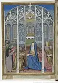 A book of hours is a manuscript designed for personal devotion and was popular in the Middle Ages. This illuminated work made for Charles, Count of Angoulême by the painter Robinet Testard is an unusual volume and is more comprehensive than just a set of devotions. The artist seems to understand his sponsor's character. As well as its devotional purpose, the book seems designed to entertain, to arouse curiosity (f. 52v), to amuse (ff 3r, 4v and 5r), to satisfy the sponsor's aesthetic sense (ff. 16v and 26v), to encourage his pastoral feelings (f. 20v), to encourage his chivalrous instincts (f. 2v) and even to flatter him (f. 41v).[2]