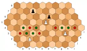 In 1978–79 Dave McCooey and Richard Honeycutt developed another variation of hexagonal chess very similar to Gliński's, having four differences: the starting array (including seven pawns per side instead of nine); the pawn's capturing move; pawns on the f-file are not permitted an initial double step; and stalemate is counted as a draw (players receive half a point).[11]