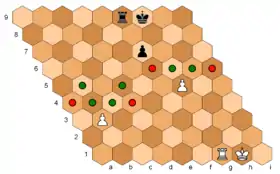 The game is played on a vertically oriented regular hexagonal board with sides 6 cells long, which has 91 hex cells having three colours (light, dark, and mid-tone), with the middle cell (or "hex") usually mid-tone.[5] The usual set of chess pieces is increased by one bishop and one pawn. The board has 11 files, marked by letters a–l (letter j is not used), and 11 numbered ranks (which bend 60° at file f). Ranks 1–6 each contain 11 cells, rank 7 (filled with black pawns in the initial setup) has 9 cells, rank 8 has 7, and so on. Rank 11 contains exactly one cell: f11.