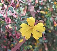 Hibbertia empetrifolia, commonly known as trailing guinea-flower,[2] is a species of flowering plant in the family Dilleniaceae and is endemic to south-eastern Australia. It is a low-lying to spreading shrub with wiry stems, oblong to lance-shaped leaves with the narrower end towards the base, and pale to bright yellow flowers arranged on the ends of branchlets, with five to nine stamens arranged on one side of the two carpels.