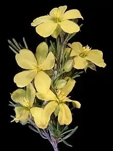 Hibbertia hibbertioides is a prostrate or sprawling shrub that typically grows to a height of up to 30 cm (12 in) and usually has glabrous branches, at least when they are mature. The leaves are crowded, pale-coloured, linear and cylindrical to triangular in cross-section, 3.5–17 mm (0.14–0.67 in) long and 0.5–0.6 mm (0.020–0.024 in) wide. The flowers are arranged singly in leaf axils or on the ends of short side shoots, and are sessile or on a peduncle up to 17 mm (0.67 in) long with inconspicuous bracts 1–2 mm (0.039–0.079 in) long. The flowers are 10–15 mm (0.39–0.59 in) in diameter with five sepals joined at the base, the inner sepals 5.5–7.5 mm (0.22–0.30 in) long, the outer ones distinctly shorter. The five petals are yellow, egg-shaped with the narrower end towards the base and 5–9 mm (0.20–0.35 in) long with a small notch at the tip. There are usually eleven stamens, nine fused at the base in groups of three and one or two free, arranged around the three glabrous carpels that each contain one ovule.[2][3]