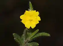 This hibbertia grows in woodland, mallee and heathland from near Mingenew to Katanning and Kojonup in the Avon Wheatbelt, Geraldton Sandplains, Jarrah Forest, Mallee and Swan Coastal Plain biogeographic regions of south-western Western Australia.[2][6]