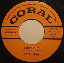 On November 5, 1955, "Hidin' Out" was released as single on Coral Records. It was the second single release in Cline's career.[4] On the flip side was the song, "Turn the Cards Slowly."[5] "Hidin' Out" was released in November to coincide with WSM's yearly birthday celebration. Cline attended the event to promote the single and attended a performance of the Grand Ole Opry.[6] Despite its promotion, "Hidin' Out" failed to chart the Billboard Hot Country Songs survey.[7] The song was first included on Cline's extended play release, Songs by Patsy Cline.[8] It has since been reviewed by critics and journalists. In reviewing Cline's 1994 compilation, Golden Classics, AllMusic described the track as having "textbook honky-tonk, with shivering steel and plaintive fiddle."[1] In an additional review, Cub Koda noted that "Hidin' Out" would be "far better-suited to Kitty Wells, but Cline's approach is both musical and varied, given the sawing fiddles and paint-by-numbers backing."[9]