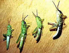 The African rice grasshopper, Hieroglyphus daganensis[1][2] is a medium-sized grasshopper species found in the Sahel region. Although not called a locust in English, this species shows gregarious behaviour and some morphological change (phase polymorphism) on crowding[3] and may become a moderately important pest species for small-holder farmers in the region.[4][5][6][7][8][9][10][11][12][13][14][15]