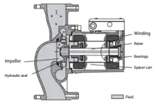 The primary design factors of a high efficiency glandless circulating pump include an electronically commutated synchronous motor, a permanent magnet rotor, and canned rotor technology. An electronically commutated synchronous motor is used to convert the energy current from a DC energy source into an AC current which is supplied to the drive motor. It utilizes the magnetomotive force which is generated by surface currents placed on the surfaces of the stator and rotor and the permanent magnets to generate the electric current which is in output to the drive motor.[5] The canned rotor technology eliminates the need for a shaft seal that many conventional pumps must use through its unique design. Whereas standard pumps with shaft seals have multiple chambers with different rotating parts in each, canned rotor technology allows all of the rotating parts within the pump to exist in a single chamber. This increases the overall efficiency since the liquid used to lubricate the shaft bearings is also used to cool the motor.[3] The electronic components of the motor are attached outside this system by means of an encapsulated motor cartridge, which is an independent metal compartment used solely for housing the electronic components.[6]