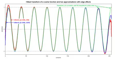 The real part of the output sequence is the original input sequence, so that the complex output is an analytic representation of u[n]. When the input is a segment of a pure cosine, the resulting convolution for two different values of N is depicted in Figure 4 (red and blue plots). Edge effects prevent the result from being a pure sine function (green plot). Since hN[n] is not an FIR sequence, the theoretical extent of the effects is the entire output sequence. But the differences from a sine function diminish with distance from the edges. Parameter N is the output sequence length. If it exceeds the length of the input sequence, the input is modified by appending zero-valued elements. In most cases, that reduces the magnitude of the differences. But their duration is dominated by the inherent rise and fall times of the h[n] impulse response.