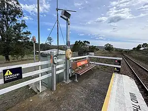 Hilldale consists of a single wooden and concrete platform about three metres long. It is serviced by NSW TrainLink Hunter line services travelling between Newcastle and Dungog. There are five services in each direction on weekdays, with three on weekends and public holidays.[3] It is a request stop with passengers required to notify the guard if they wish to alight and "flag" the train down if they wish to board.