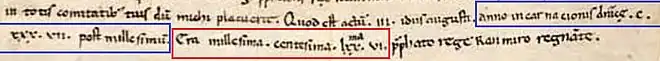 The Spanish era was used throughout the Visigothic Kingdom, which covered all of the Iberian Peninsula and the region of Septimania.[1] It was even used in parts of North Africa.[4] It continued in use in these regions but gradually fell away before the end of the Middle Ages.[1] Official usage of the era ceased in different parts of the peninsula at different times: Catalonia dropped the era (as well as the French king's regnal year) in AD 1180, Aragon in 1349/1350, Valencia in 1358, Castile in 1382/1383, Portugal in 1420/1422 and Navarre in the early 15th century.[1][2][4] While the year officially began on 1 January under the Spanish era, that was changed to 25 December when the Anno Domini system was adopted (while the Church used 11 January).[2]