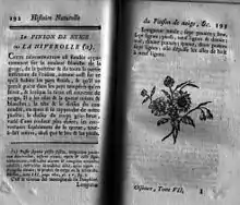 The Histoire Naturelle had a distinctly mixed reception in the eighteenth century. Wealthy homes in both England and France purchased copies, and the first edition was sold out within six weeks.[5] But Buffon was criticised by some priests for suggesting (in the essay Les Epoques de Nature, Volume XXXIV)[5] that the earth was more than 6,000 years old and that mountains had arisen in geological time. Buffon cites as evidence that fossil sea-shells had been found at the tops of mountains;[18] but the claim was seen as contradicting the biblical account in the Book of Genesis. Buffon also disagreed with Linnaeus's system of classifying plants as described in Systema Naturae (1735). In Buffon's view, expounded in the "Premier Discours" of the Histoire Naturelle (1749), the concept of species was entirely artificial, the only real entity in nature being the individual; as for a taxonomy based on the number of stamens or pistils in a flower, mere counting (despite Buffon's own training in mathematics) had no bearing on nature.[19]