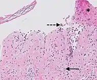 | Prevesicular stage of bullous pemphigoid | Image at right shows influx of inflammatory cells including eosinophils and neutrophils in the dermis (solid arrow) and blister cavity (dashed arrows), and deposition of fibrin (asterisks).[15] However, the diagnosis of bullous pemphigoid consist of at least 2 positive results out of 3 criteria:[19]